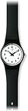 Swatch-Uhr SOMETHING NEW LB153 mit einem Kunststoffgehäuse, wasserdicht geprüft bis 3 bar. Ein schwarzes Armband, Dornschliesse, Quarzuhrwerk und ein weißes Zifferblatt runden das Design dieser Swatch-Uhr ab.